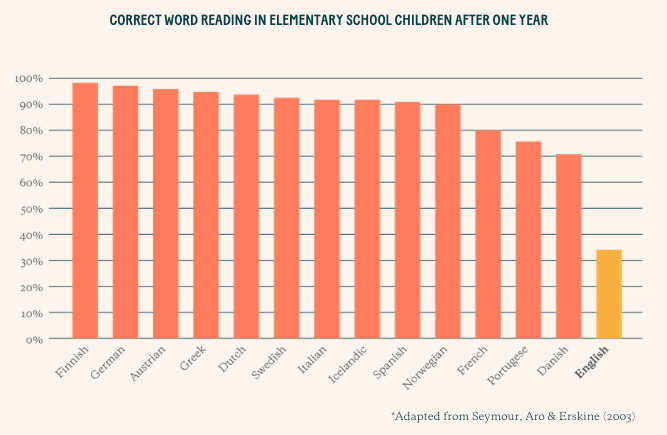 Here's a fact that should make every educator stop cold: after one full year of instruction, students learning phonetically consistent languages like Spanish or Finnish hit 90%+ word-reading accuracy. Students learning English? 35%.